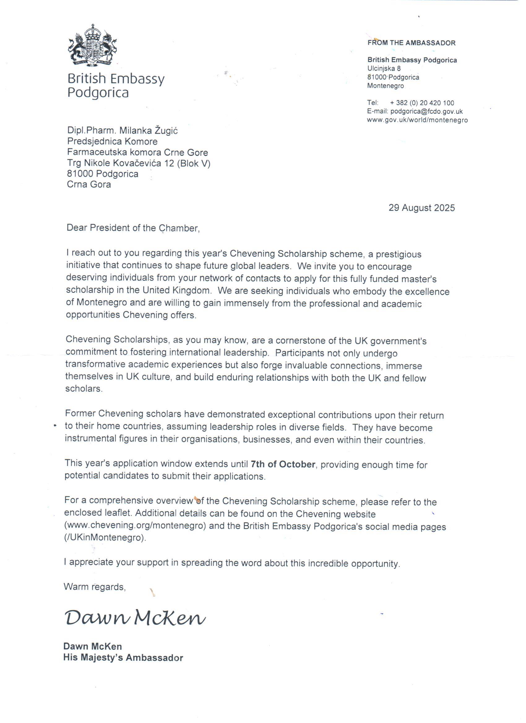 DOPIS: CHEVENING SCHOLARSHIP SCHEME
